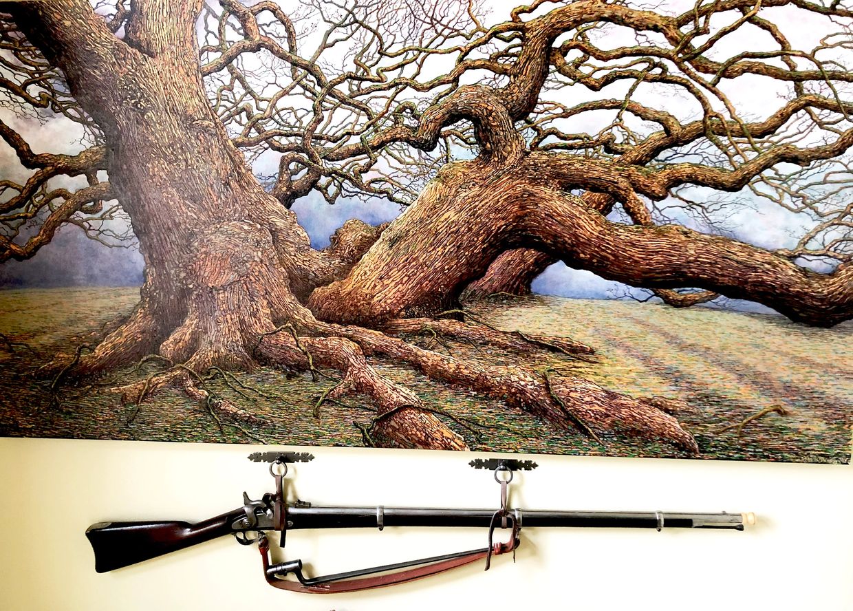 resides at old Fort Harrod in Harrodsburg, Kentucky. In fact, its age and size qualify it as an unofficial national champion. Within a block of the tree stands Rocky Point Manor that was built in 1810. After the battle of Perryville in Oct, 1862, this manor served as a hospital for both Union and Confederate soldiers. The grounds nearby served as a triage station. The tree witnessed the suffering of tens of wounded and dying soldiers. It is suspected that the tree itself served as a shaded- resting spot for some of these soldiers. A massive painting of this witness tree has recently been made by the famous tree artist - Mr. Charles Brindley of Adairville, Kentucky. The 6’ long painting now graces the home wall of Gary Strobel who is responsible for this witness wood pen collection. Below the painting hangs a relatively rare civil war era Remington contract Springfield rifle of 0.58 caliber.