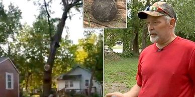 a black walnut tree growing near the historic Overfelt-Johnston home in Independence, Mo., was cut down by Mr. Jeff Eastham and Mr. Larry Smith brought the tree for lumber. Upon cutting the tree in sections a cannonball rolled out of a crotch in the tree. It was about 2.5 inch in dia., weighed about 2 lbs. and was solid lead. As nearly as can be determined it was fired from a Woodruff cannon by the Union army during one of the two battles for Independence, Mo., during the Civil War. The tree, by ring count, was well over 200 years old and it truly witnessed the war.