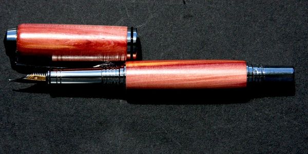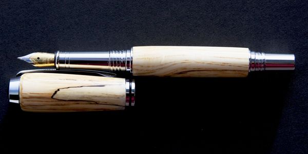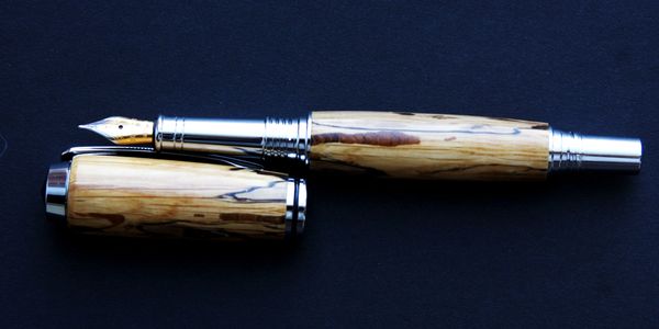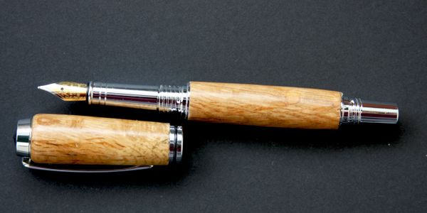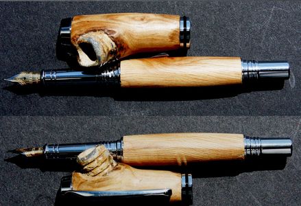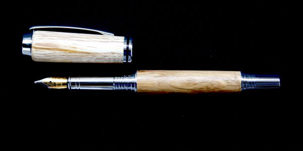 is a post oak (large tree on the left) that is 4.3’ in dia. and is well over 250 years old. The pen is beautifully spalded by fungal growth. The collection of dead wood from the tree and the church/tree photo were made by John and Eileen Huffman of Appomattox, Va.