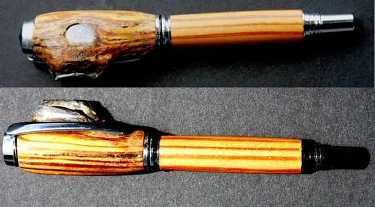 from one pine tree located within a mile or so from Dinwiddie Court house as shown in the photo above. Only recently did this tree die. A number of pine trees still grow in the area of Dinwiddie Courthouse that contain bullets fired during this heavy military engagement. The wood of these pines is commonly called heart pine and it can originate from Loblolly, Long -leaf, Short- leaf or Pond Pine. A piece of wood with a bullet in it was obtained from Ian Workman and made into the pen as shown. The lead in the wood is comparable to that of a 58 caliber minie ball.